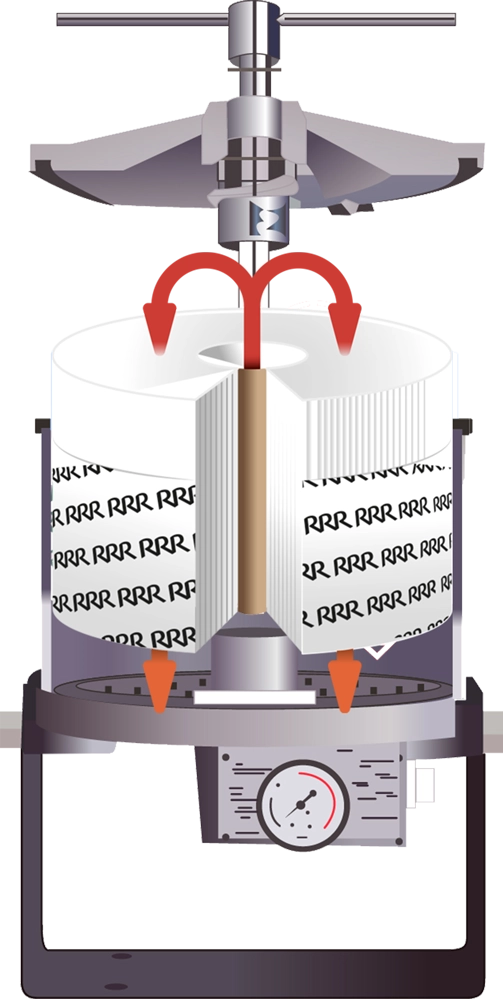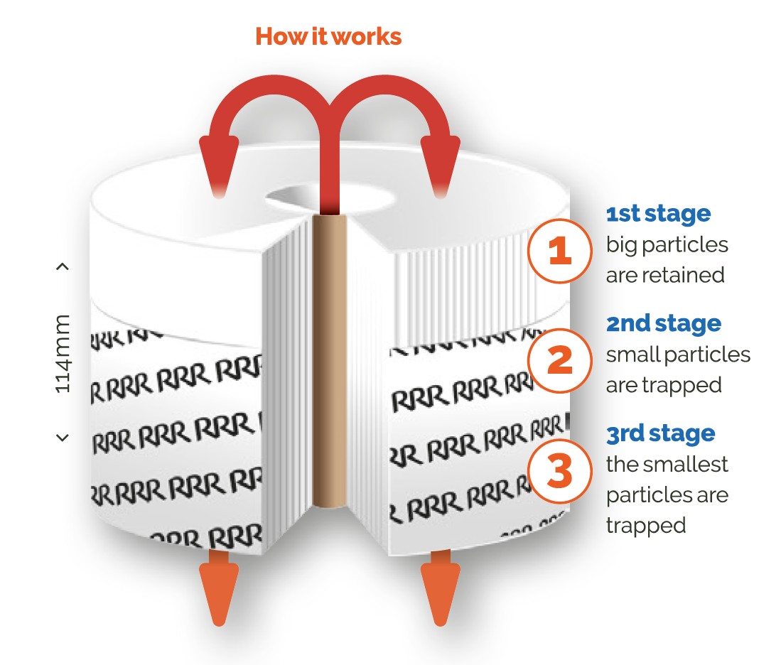 Daarnaast is het Triple R filterelement op een unieke manier gewonden, waardoor het een licht conische structuur heeft. Dit ontwerp creëert een natuurlijke scheiding van verschillende deeltjesgroottes: